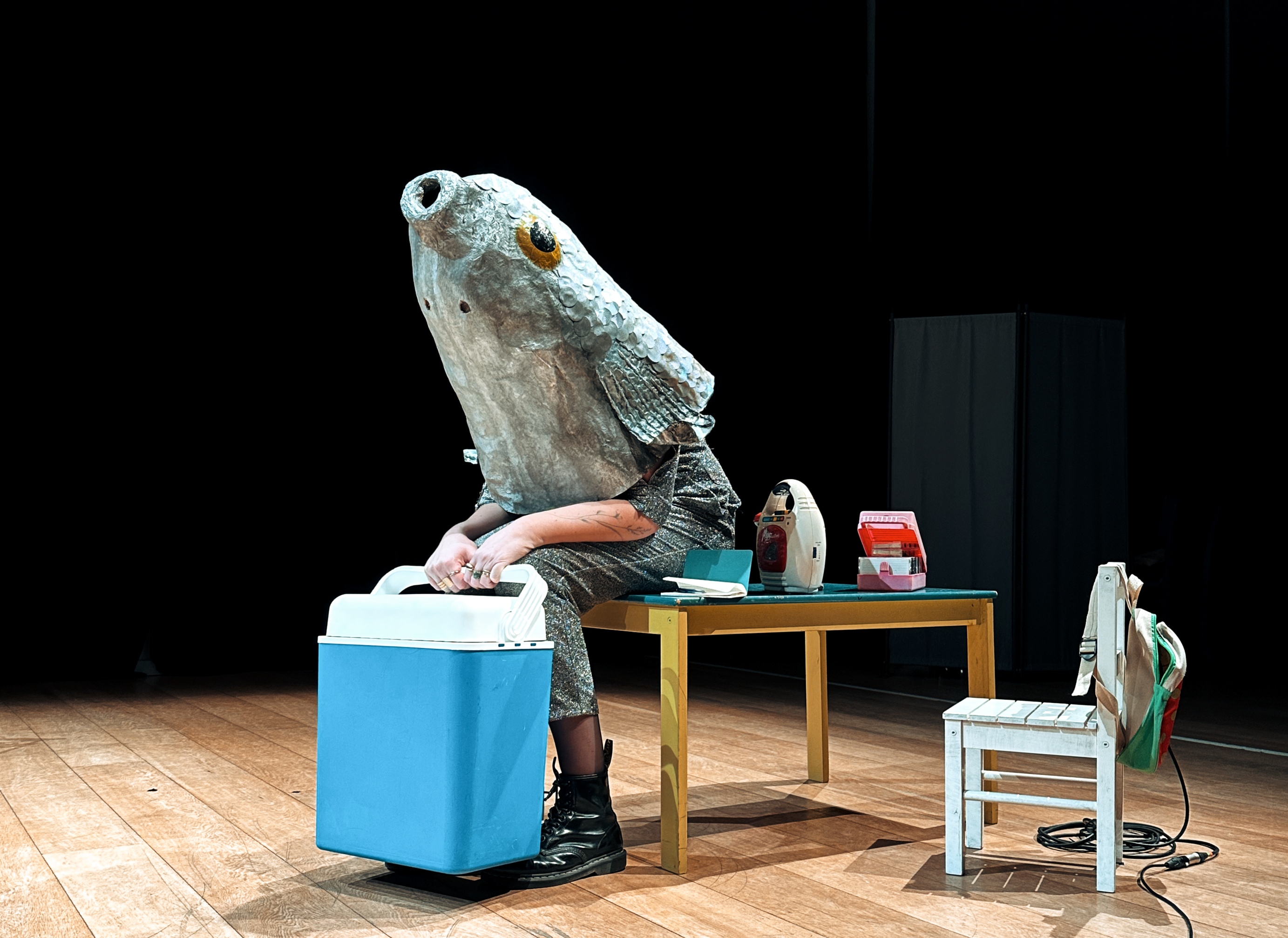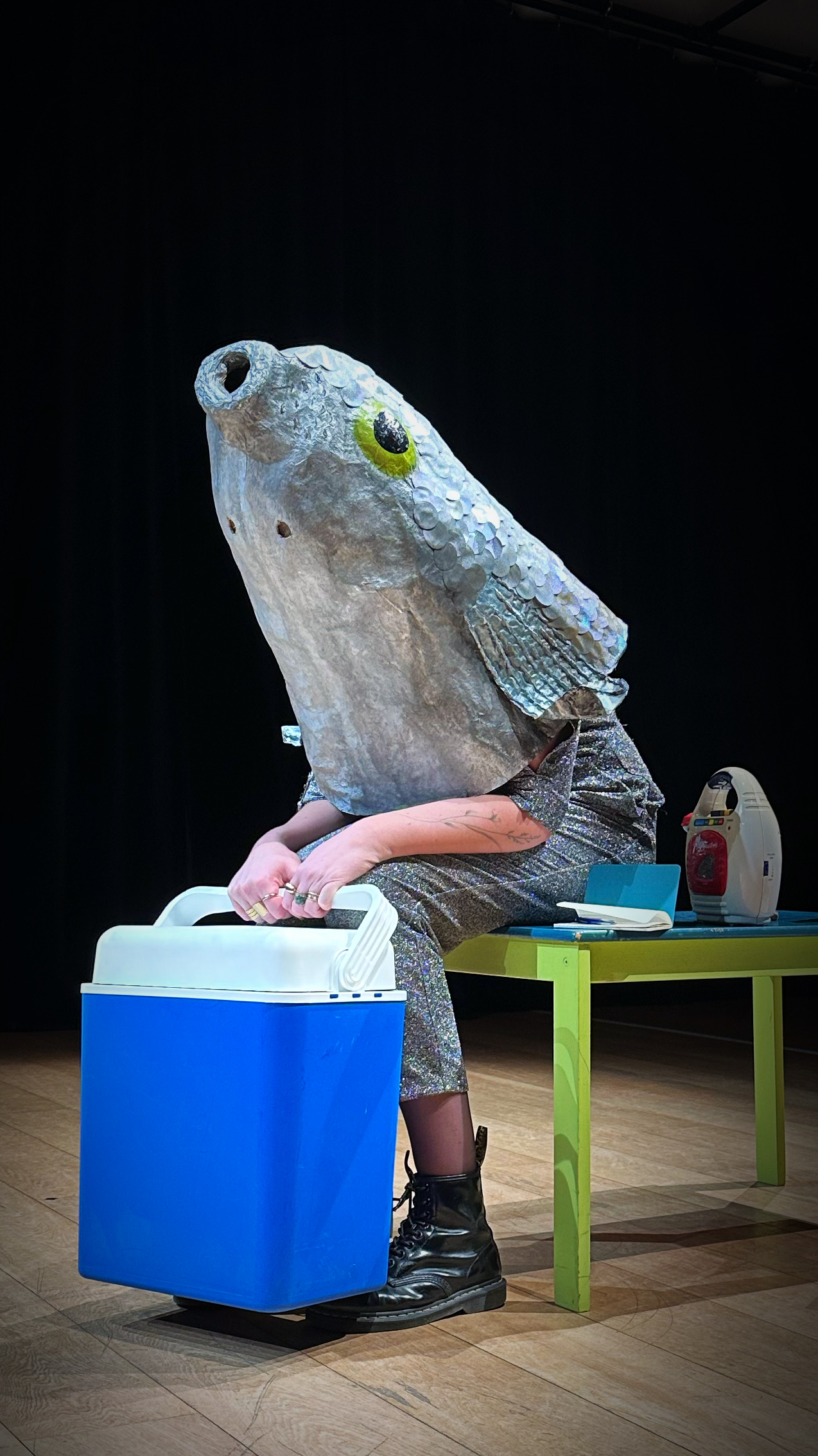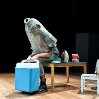 Seule sur scène au milieu de ses jouets, assise pour l’éternité à la table des enfants, elle entreprend une discussion avec elle-même petite.
