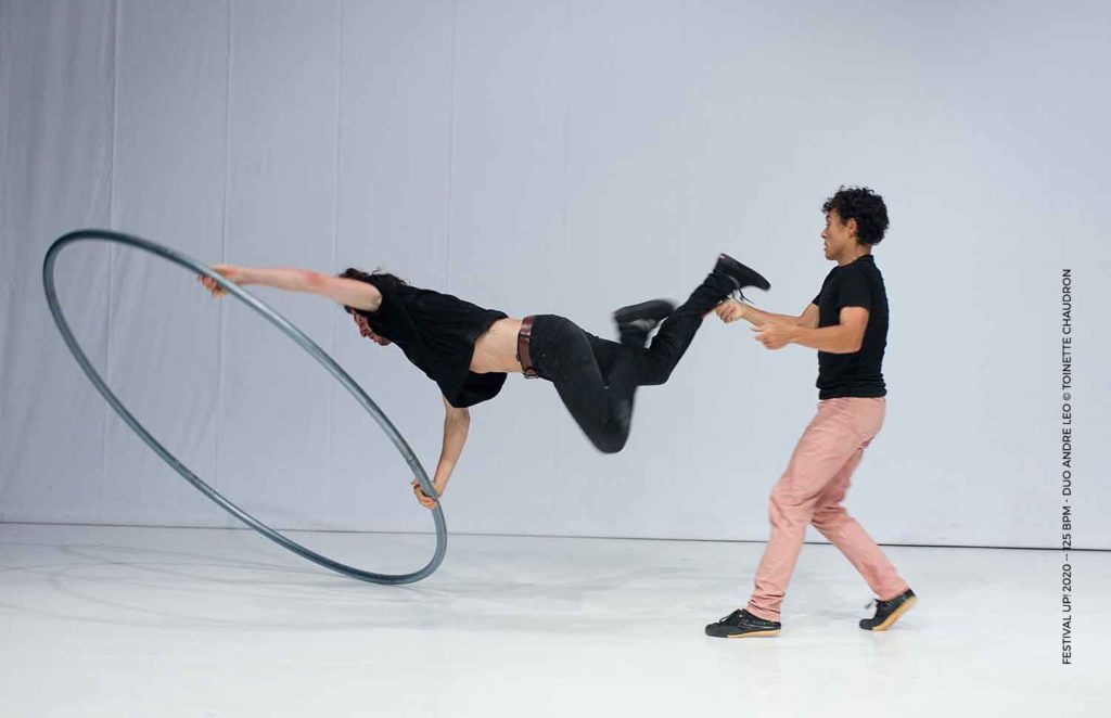 Une complicité espiègle et vivifiante entre deux acrobates et leur roue Cyr.