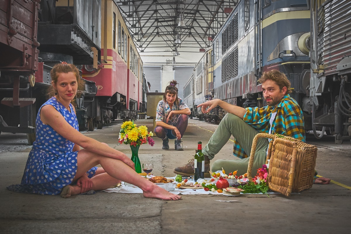 Emprisonnés par la peur, face à leur impuissance, nos trois amis déconfits pique-niquent pour sauver les apparences. Mais les personnages de ce joli tableau incarnent peu à peu les ombres de leurs propres angoisses. Voie 3 se dessine alors un champ de bataille où, dans l’attente, éclate une guerre territoriale.