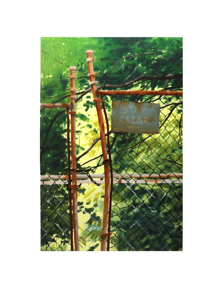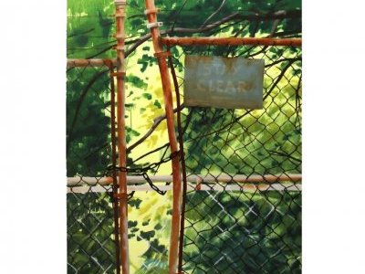 Chez Diego Herman la périphérie prend un sens littéral, c’est celle qui fait le tour, délimite, rigidifie l’espace qui nous entoure. Les grillages qu’il peint de manière obsessionnelle entravent tant les corps que la vue de l’horizon. Si le rideau de fer est lourd et nous parait inébranlable, Diego, par la lumière, la couleur qui prend le dessus et les trous dans la maille de métal nous offre un point de fuite, une place dans l’horizon.