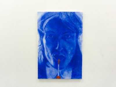 En périphérie du genre et de ses stéréotypes, Lucas Loop déploie des autoportraits mettant en scène sa propre fluidité. Les trais de son visage et de son corps deviennent des motifs qu’il invoque dans sa peinture à chaque fois sous une forme nouvelle. En passant d’un tableau monochrome noir brillant où l’on se voit plus qu’on ne regarde, à une toile saturée de couleur, il nous surprend comme pour nous interdire de savoir quoi penser de son visage ou de sa peinture. Ainsi on naviguera en quête de ses traits. On les trouvera parfois entrelacés, parfois floutés ou bien encore de face nous regardant droit dans les yeux, noyé dans le bleu.
