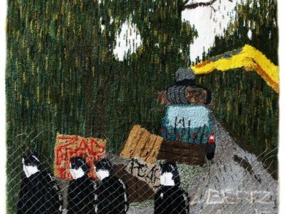 Le travail de Juliette Vanwaterloo se situe à la périphérie des manifestations, s’intéressant aux tags, poubelles brulées et vitres cassées comme à des témoignages d’une population qui n’en peut plus. Elle détourne le médium textile longtemps cantonné à l’éducation des femmes en un outil de revendication politique. Dans ses broderies, des images de violences policière issue du flux médiatique s’ancre dans les fils de manière chronophage. Ses dessins au trait naïf, ses couleurs flashy et la délicatesse de ses dentelles attraperont notre regard pour nous empêcher de détourner les yeux de la violence et de la colère qui gronde.