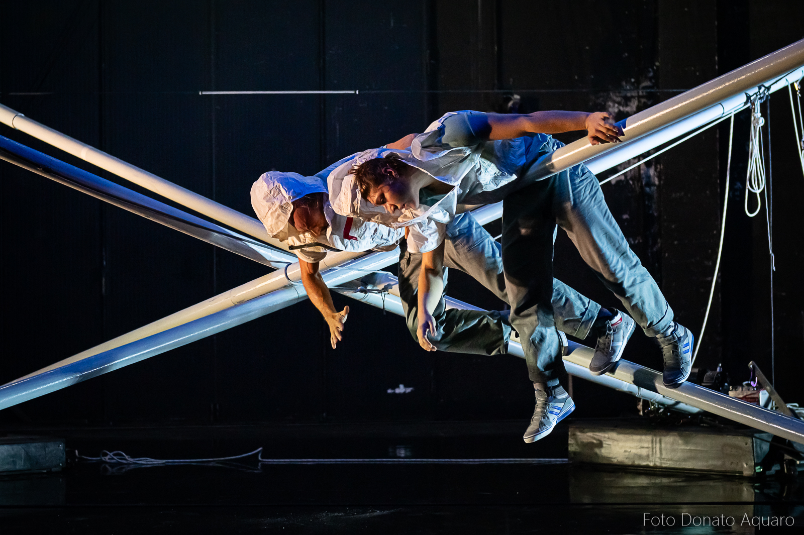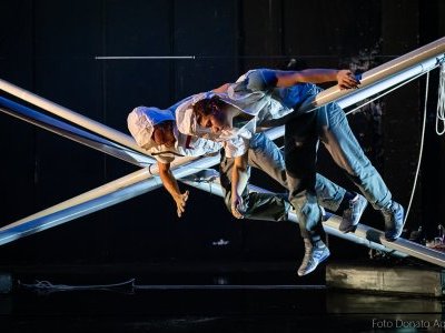 Accompanied by a musician/singer, two acrobats/dancers move around on a self-supporting apparatus, evoking the physicality and extreme conditions of sailing a boat.