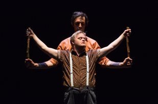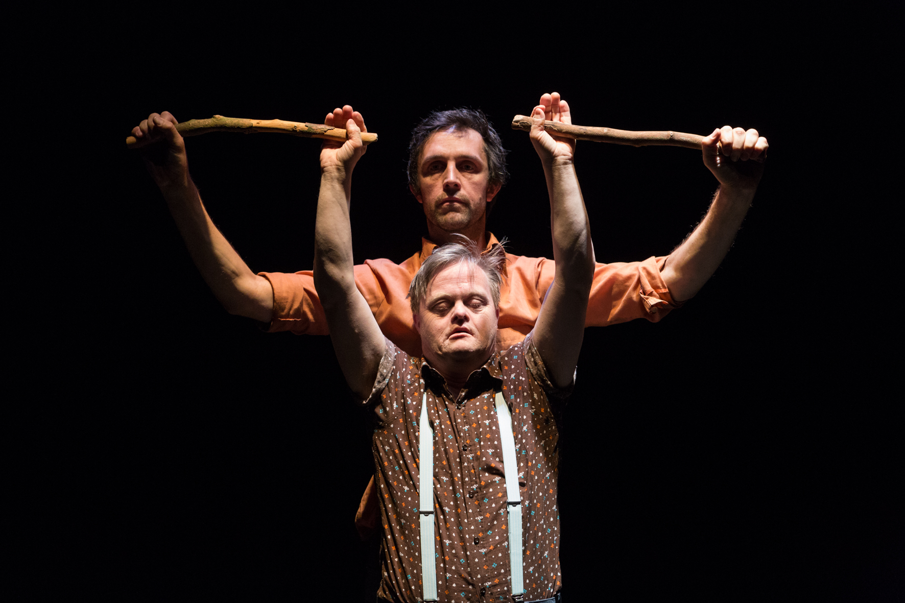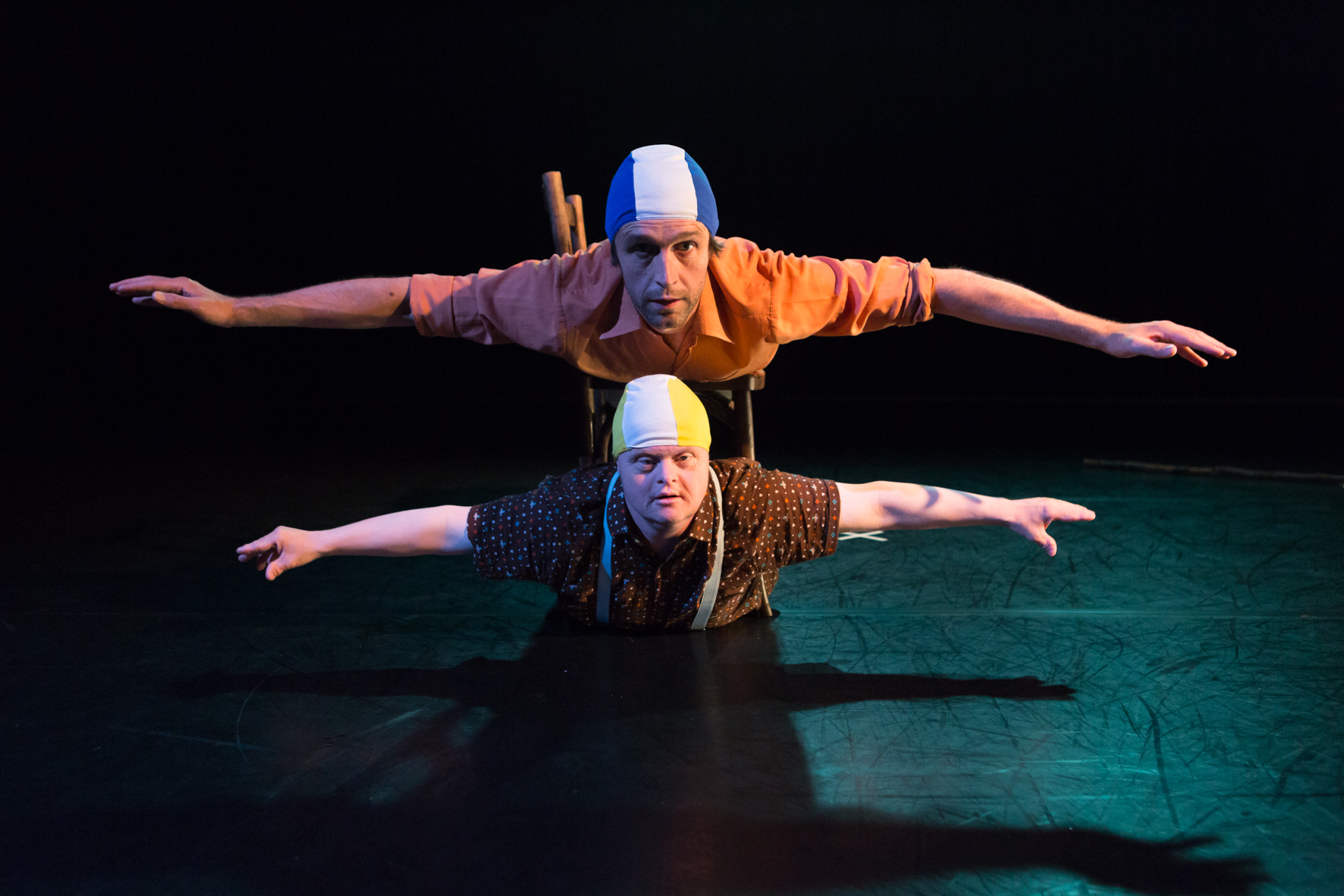 Axel et Nicolas sont différents. L’un est trisomique, l’autre pas. L’un est grand et mince, l’autre un peu moins. Hyperlaxe chorégraphie leur rencontre dans la détente, la lenteur et dans la poésie. Avec des bouts de bois, des chaises, un bouquet de fleurs, ils se lancent des défis, jouent la pesanteur et l’équilibre de leur complicité. Dans ces moments suspendus, tout est possible, comme dans un rêve. On s’imite, on se ressemble, on se jauge et on ne s’interdit pas pour autant quelques froncements de sourcils et quelques taquineries, parce qu’on a bien chacun ses petites manies.
