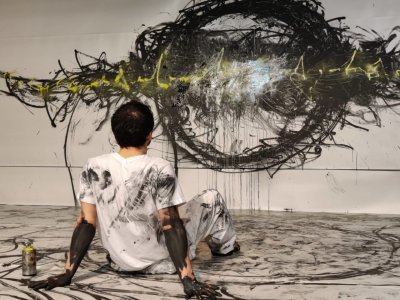 Bien que seul sur scène, le projet « Layers » est bien un duo, un dialogue entre l’homme et son outil d’expression : un marqueur blanc. Son œuvre met en corrélation, en lien ses passions communes dans lesquelles il retrouve la même énergie : la danse et le graffiti.