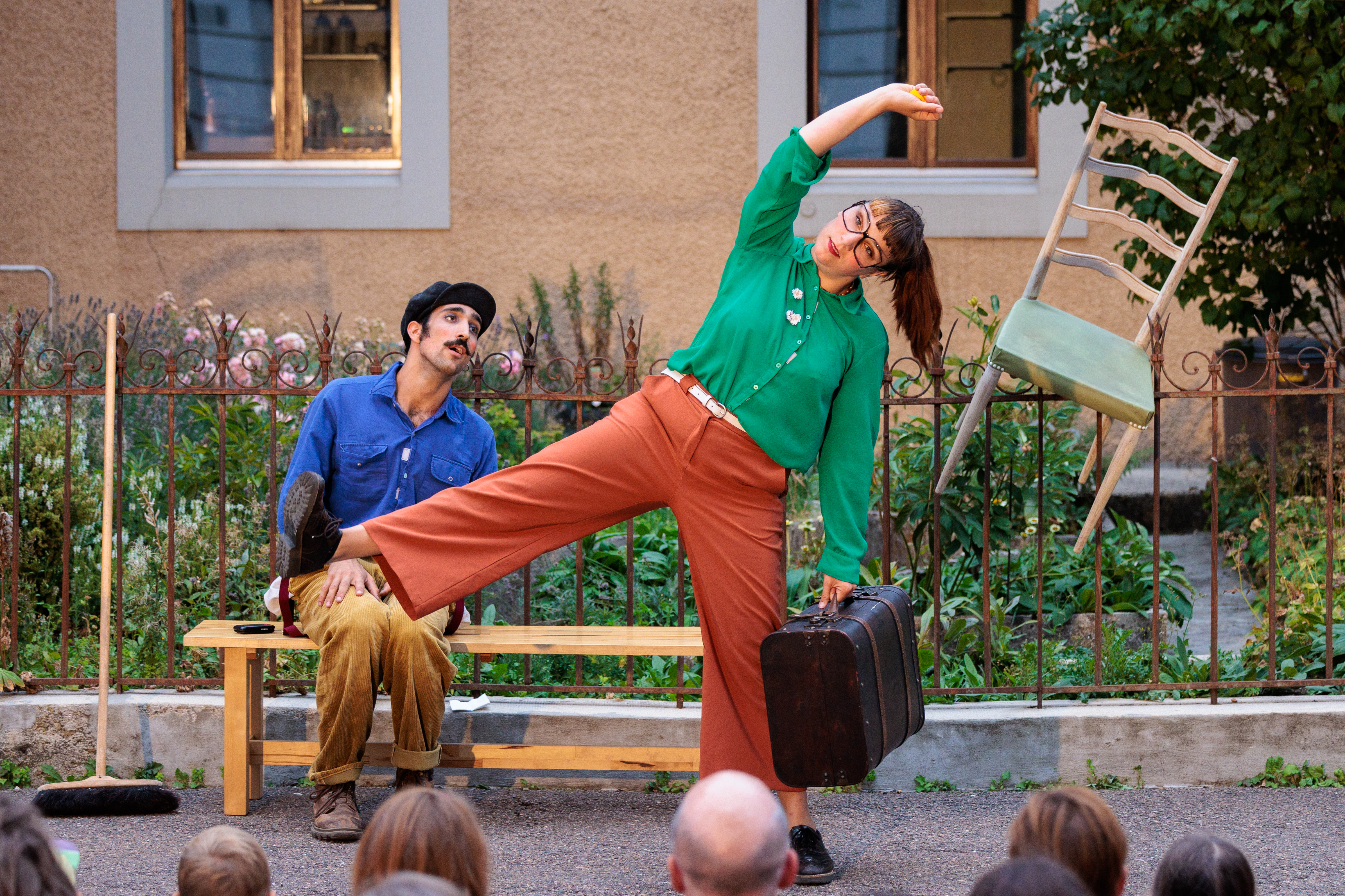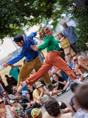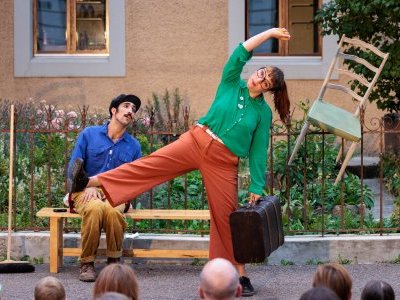 Two characters paint fragments of their encounter with humour and enchantment. A love story between a street sweeper and a female traveller, for the space of a day. Emotions swirl and spill over in their sometimes clumsy steps. The interplay of attraction becomes poetic, acrobatic and even comically absurd. We move from one scene to the next in a variety of forms (theatre, dance, burlesque and interaction with the audience).